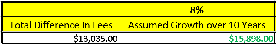 Now let’s take a look at what we would earn if we invested the difference between the above listed fees of $13,035 for another 10 years with an 8% assumed return: